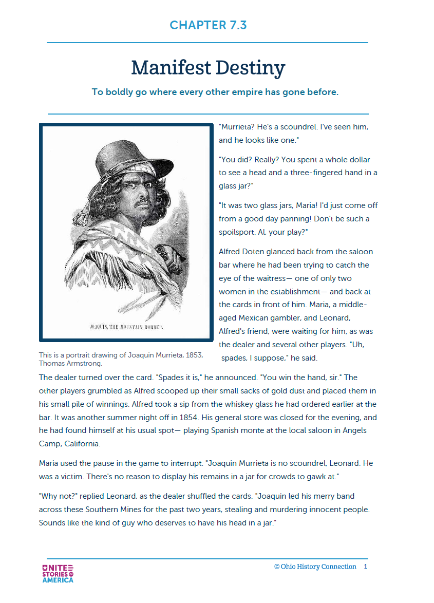 Example page of the textbook portion of United Stories of America. Each section begins with a narrative based off the real facts of history that ties into the content of the reading.
