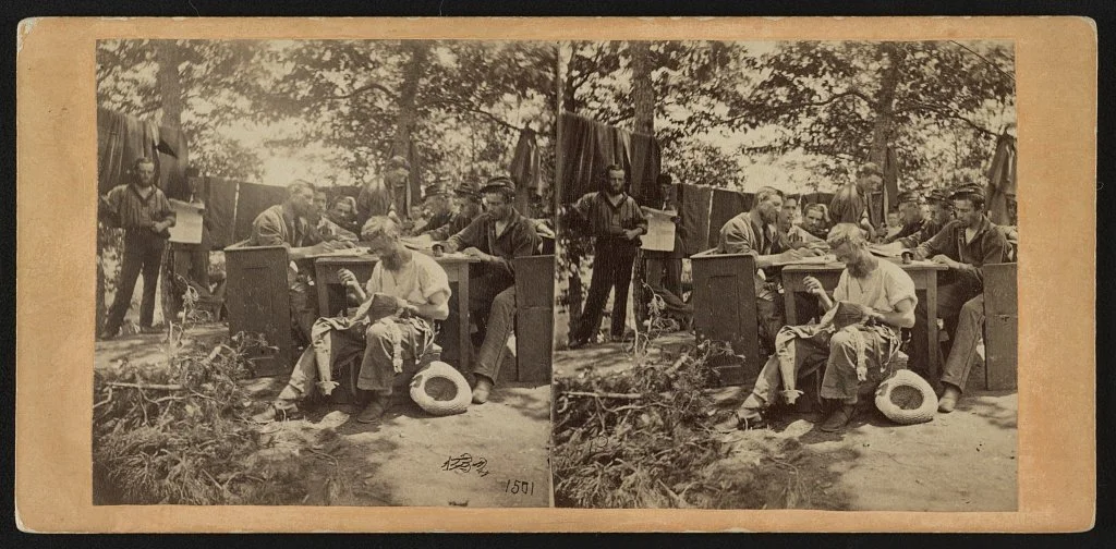 Soldiers of the Boston Light Artillery writing letters at their camp table, June 1861. Stereograph, Library of Congress, Civil War Photograph Collection.